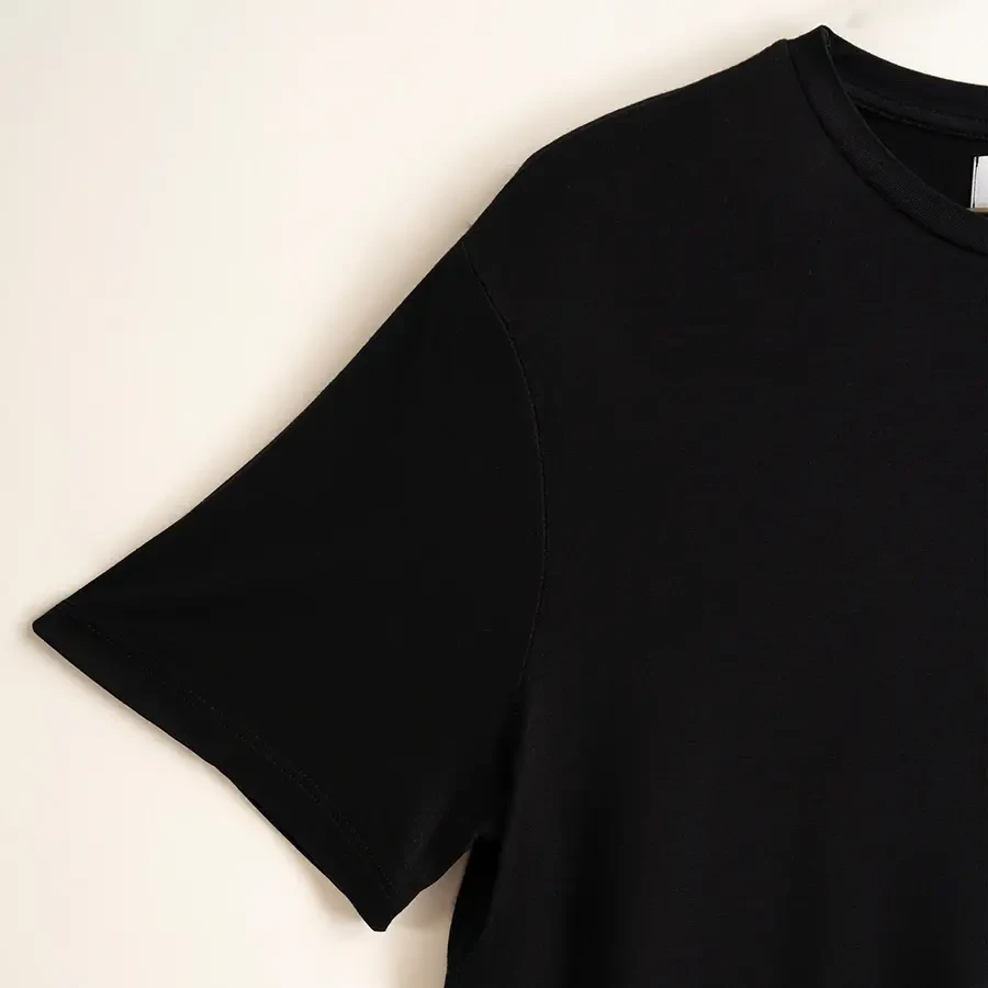 Viskon kumaşın özel dokusunda hem ev hem de dışarıda günlük kullanıma uygun, rahat kesimli, yumuşak dokulu kısa kollu t-shirtler