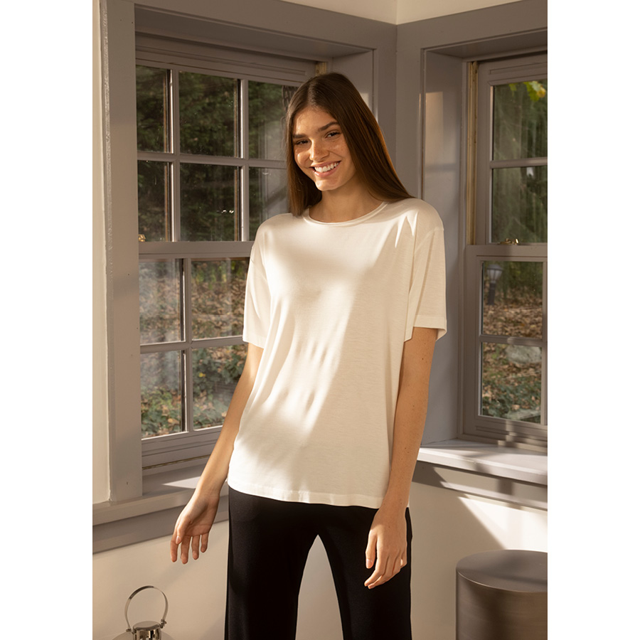 Viskon kumaşın özel dokusunda hem ev hem de dışarıda günlük kullanıma uygun, rahat kesimli, yumuşak dokulu kısa kollu t-shirtler.