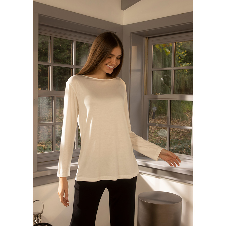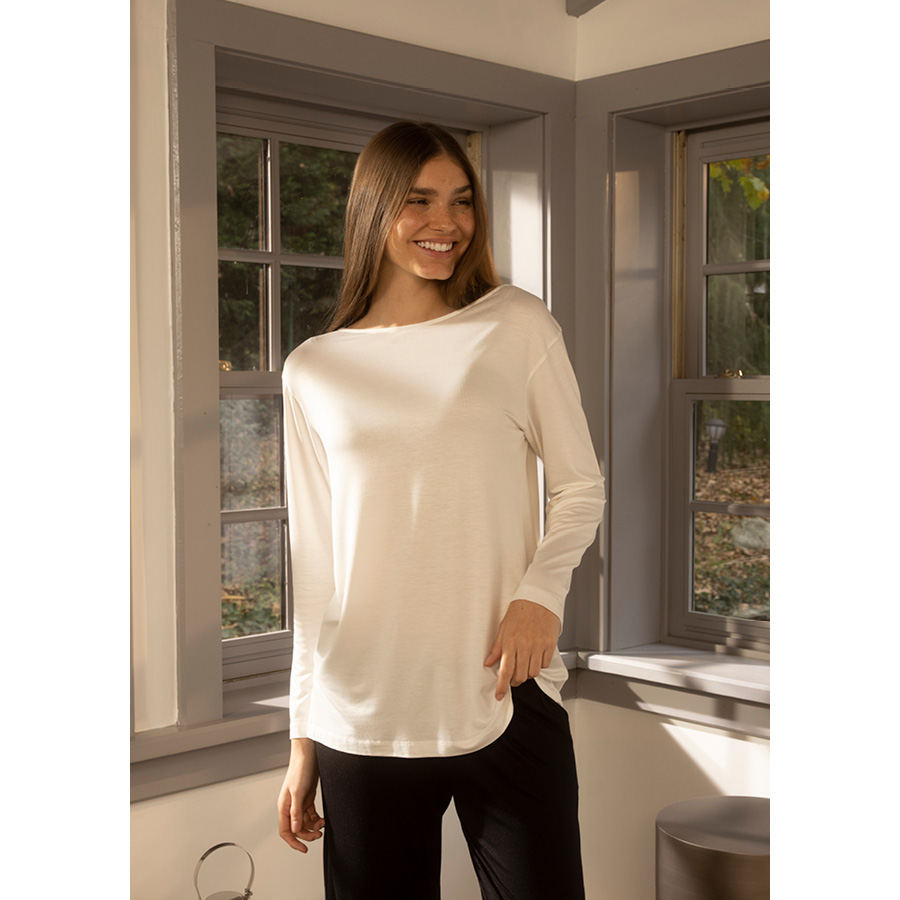 Viskon kumaşın özel dokusunda hem ev hem de dışarıda günlük kullanıma uygun, rahat kesimli, yumuşak dokulu uzun kollu t-shirtler