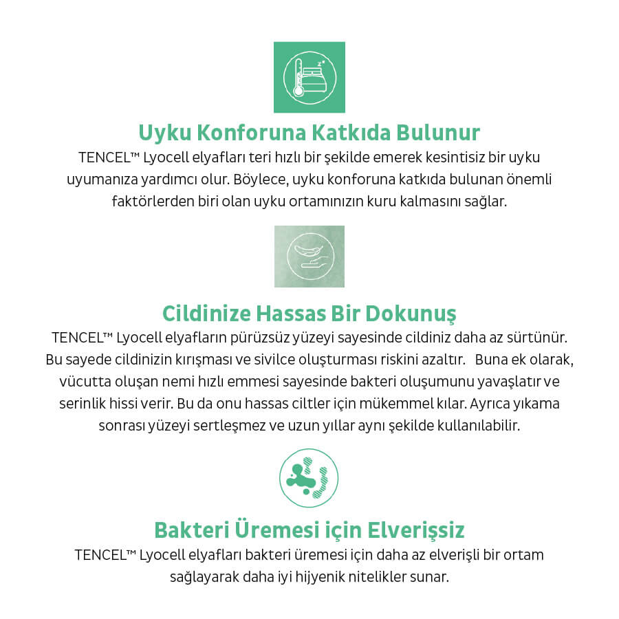 TENCEL™ Lyocell elyafları teri hızlı bir şekilde emerek kesintisiz bir uyku uyumanıza yardımcı olur. Böylece, uyku konforuna katkıda bulunan önemli faktörlerden biri olan uyku ortamınızın kuru kalmasını sağlar.