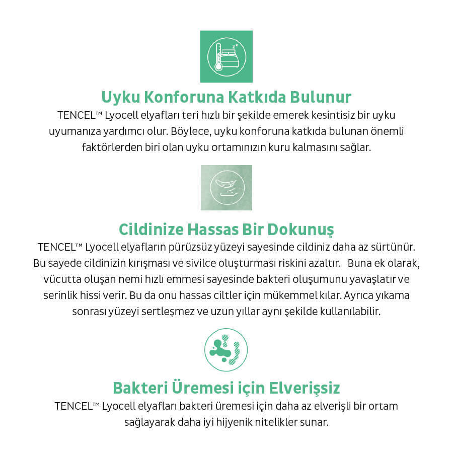 TENCEL™ Lyocell elyafları teri hızlı bir şekilde emerek kesintisiz bir uyku uyumanıza yardımcı olur. Böylece, uyku konforuna katkıda bulunan önemli faktörlerden biri olan uyku ortamınızın kuru kalmasını sağlar.