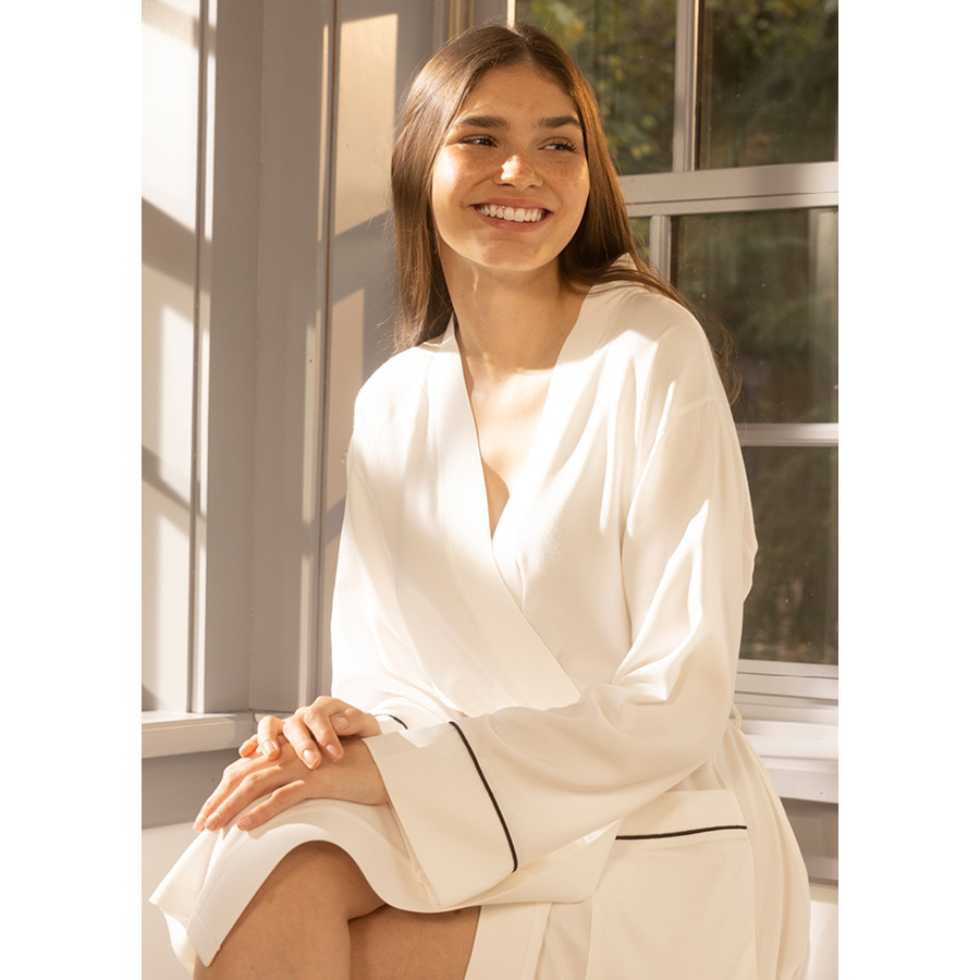 Dokuma Viskon kumaştan, siyah biye manşet ve ön cep detaylı, belinden çıkarılabilir kuşaklı sabahlık.