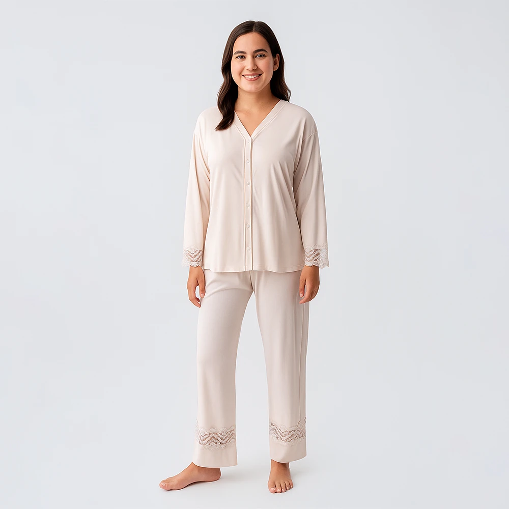 PENELOPE Lace Uzun Kollu Dantelli Esnek Viskoz Pijama Takımı - Bej/M