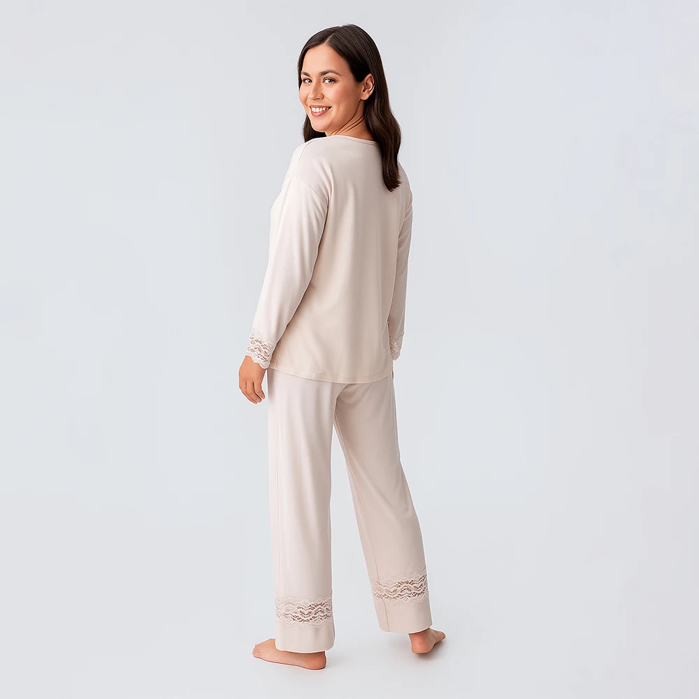 PENELOPE Lace Uzun Kollu Dantelli Esnek Viskoz Pijama Takımı - Bej/Xl