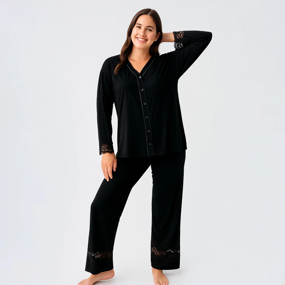 PENELOPE Lace Uzun Kollu Dantelli Esnek Viskoz Pijama Takımı - Siyah/L