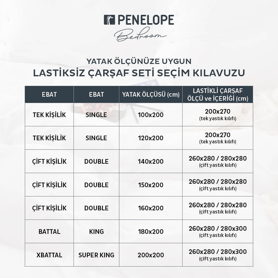 Bu zarif çarşaf seti, 260x280 cm boyutuyla 140x200, 160x200 ve 180x200 yatak modelleri için mükemmel bir uyum sağlar. Yani yatağınız hangi boyutta olursa olsun, bu çarşaf setiyle mükemmel uyku deneyimini yaşayabilirsiniz.