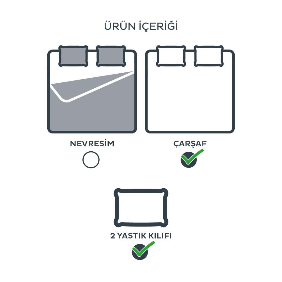 Paket içeriği, 1 adet 260x280 çarşaf ve 2 adet 50x70 biyeli standart yastık kılıfını içerir. Bu setin içinde nevresim bulunmamaktadır.