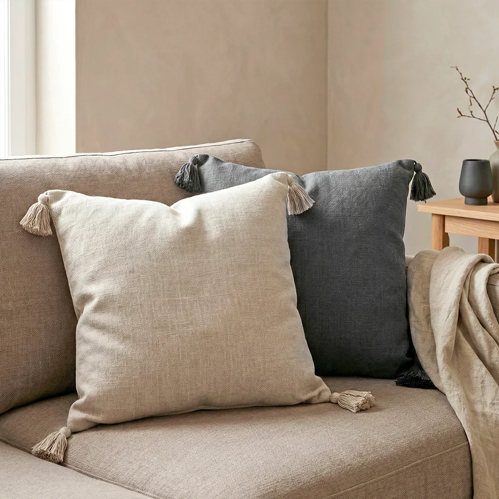 Nora Püsküllü Kırlent Kılıfı 50x50 cm Koyu Naturel