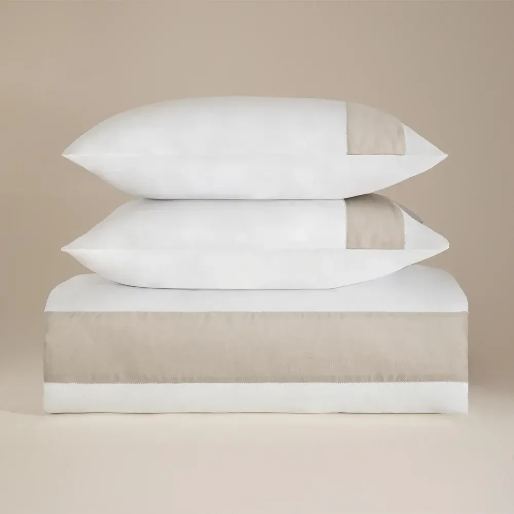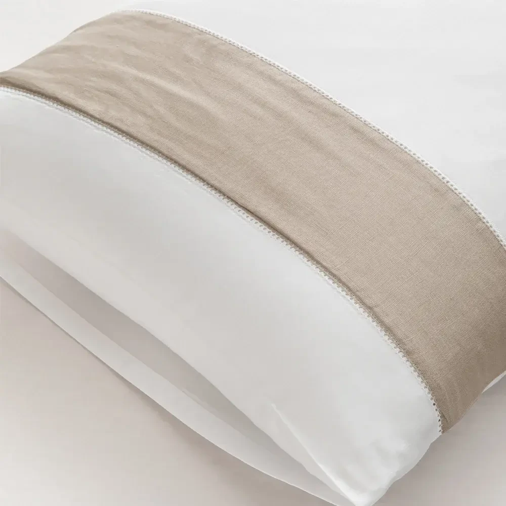 Luciano Nevresim Seti, 300 TC (120 tel) pamuk saten dokusu ve keten parça detaylarıyla yatak odanıza hem doğal bir his hem de zarif bir estetik katar.