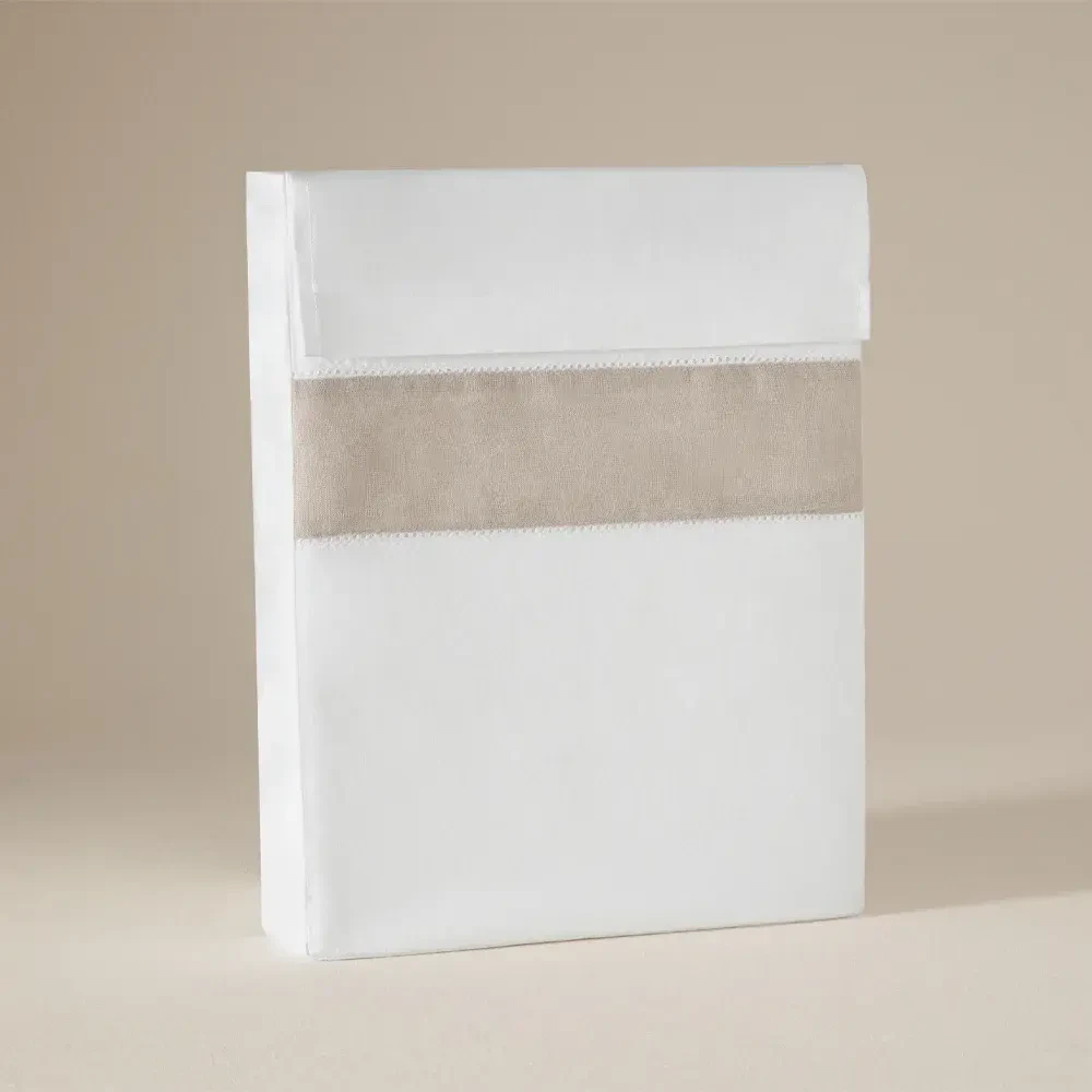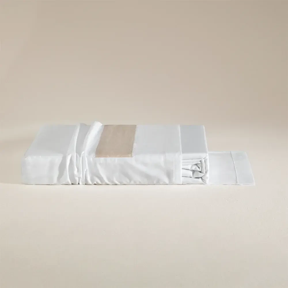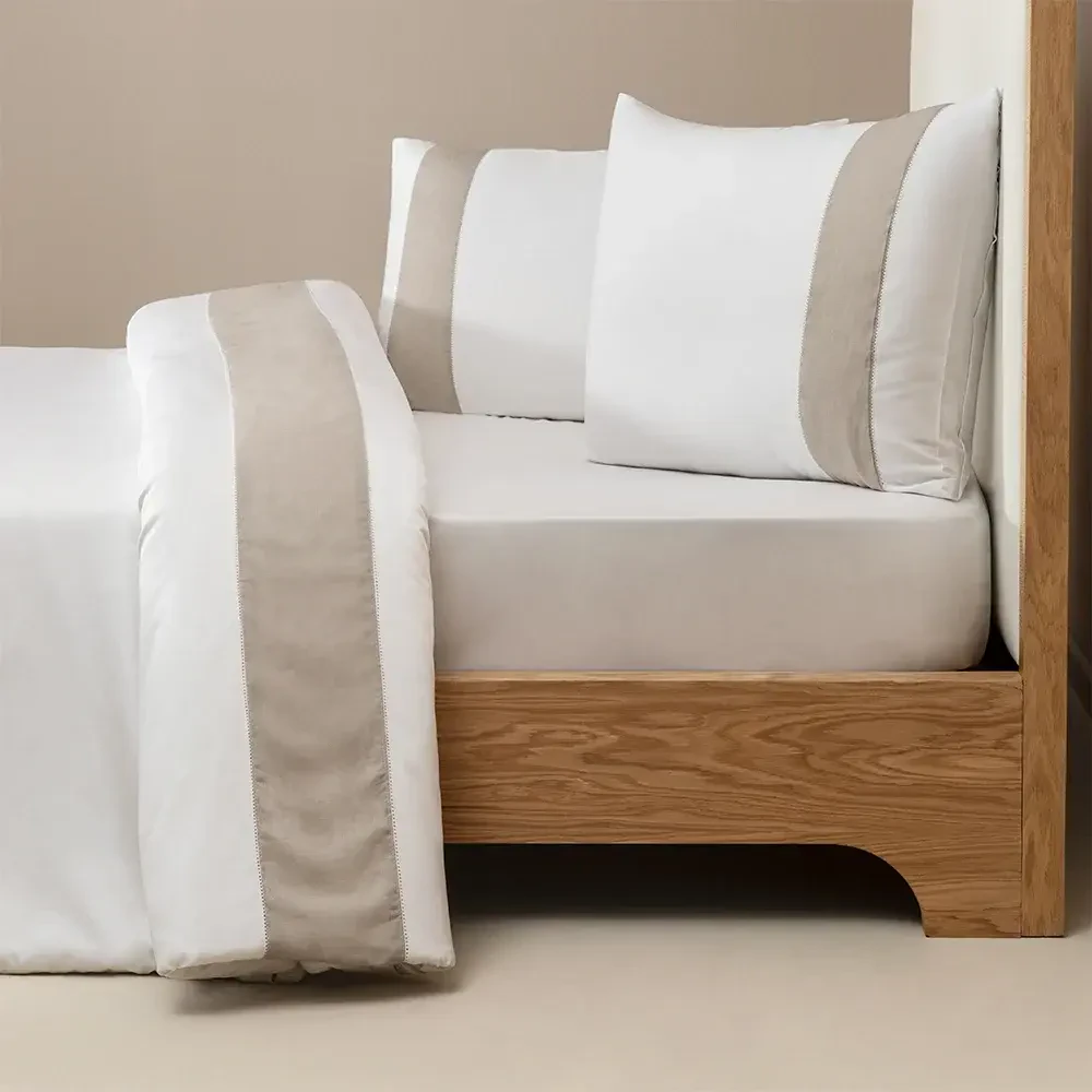 Luciano Nevresim Seti, 300 TC (120 tel) pamuk saten dokusu ve keten parça detaylarıyla yatak odanıza hem doğal bir his hem de zarif bir estetik katar.