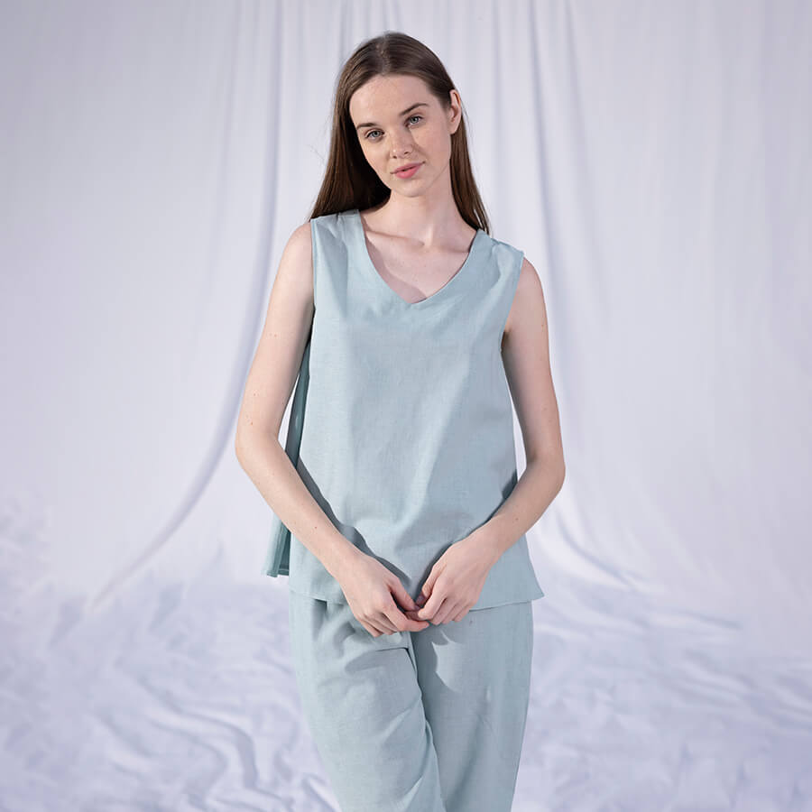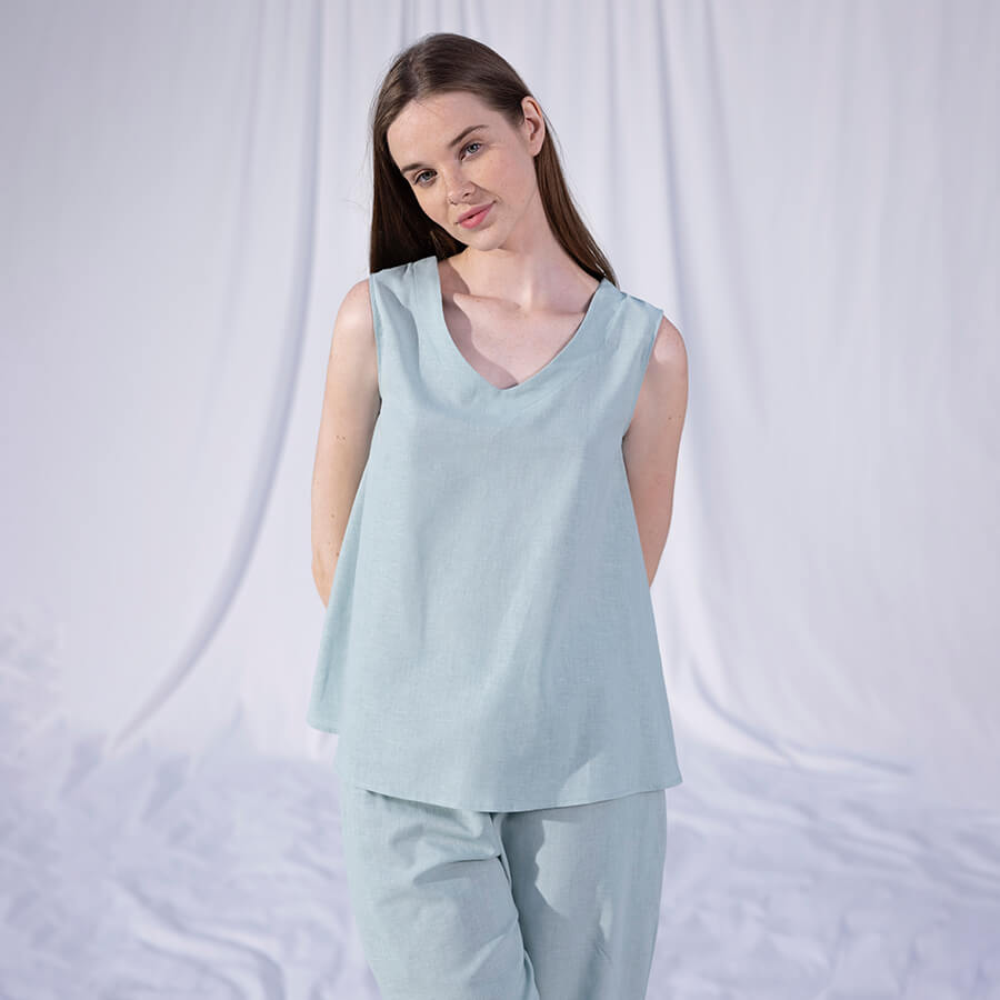 Penelope by Serli Keçoğlu Keten V Yaka Kolsuz Bluz Mint S-M