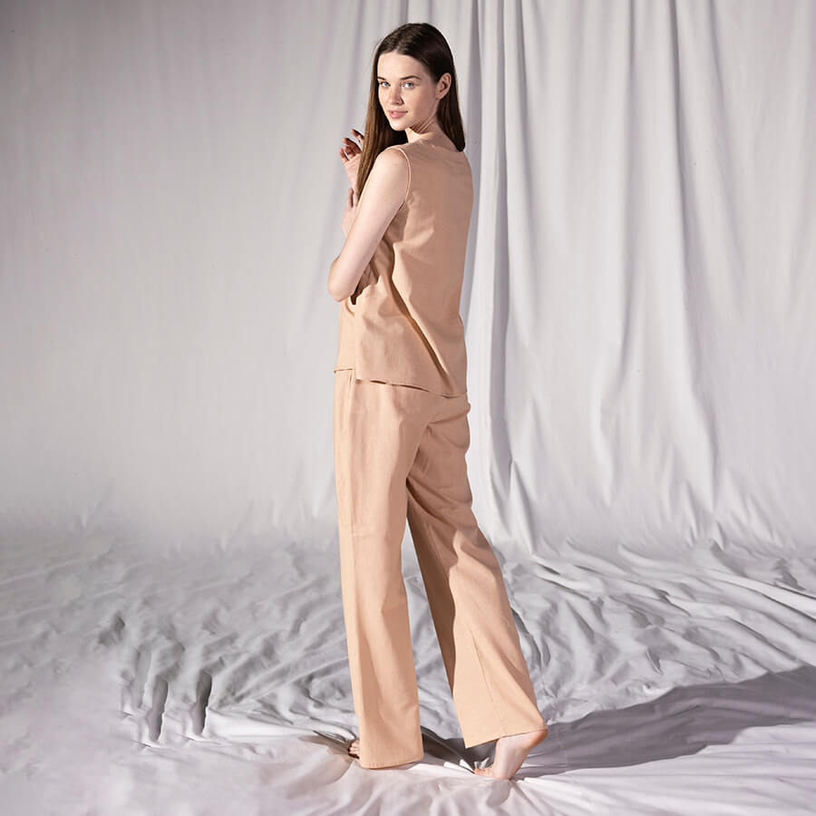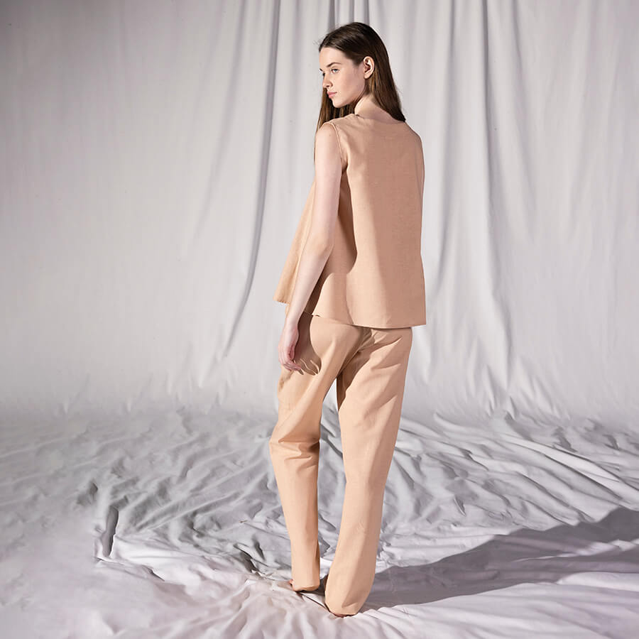 Penelope by Serli Keçoğlu Keten V Yaka Kolsuz Bluz Somon S-M