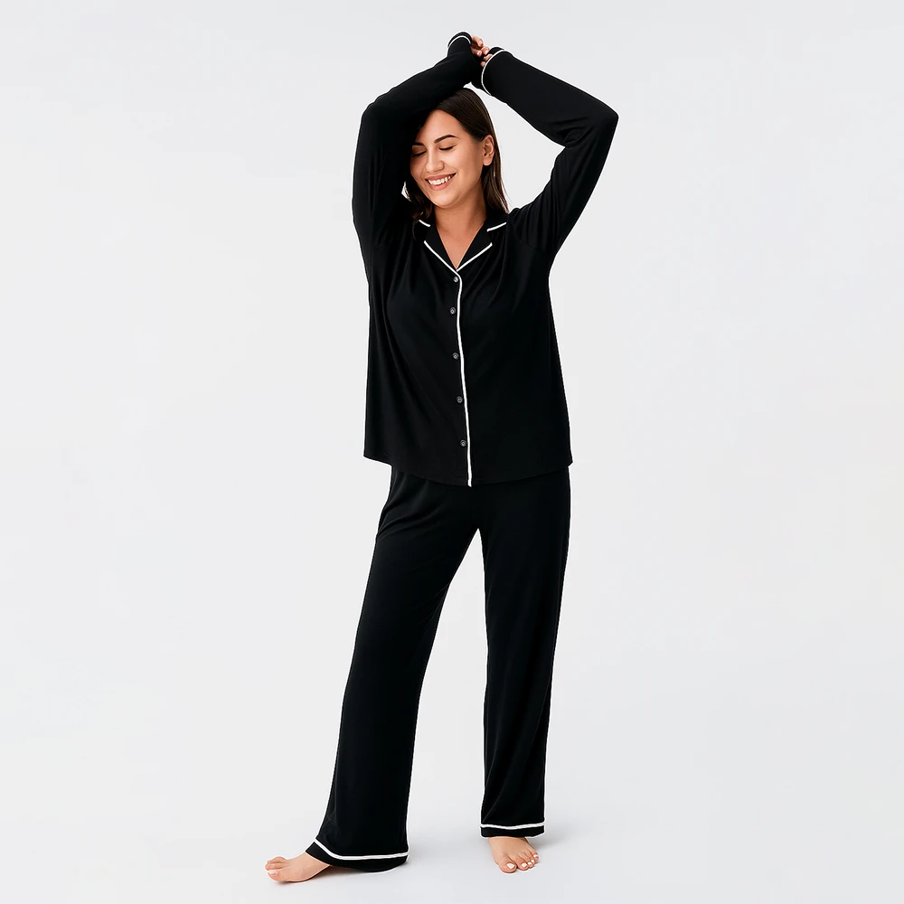 Snug Uzun Kollu Oversize Esnek Viskoz Pijama Takımı - Siyah/S