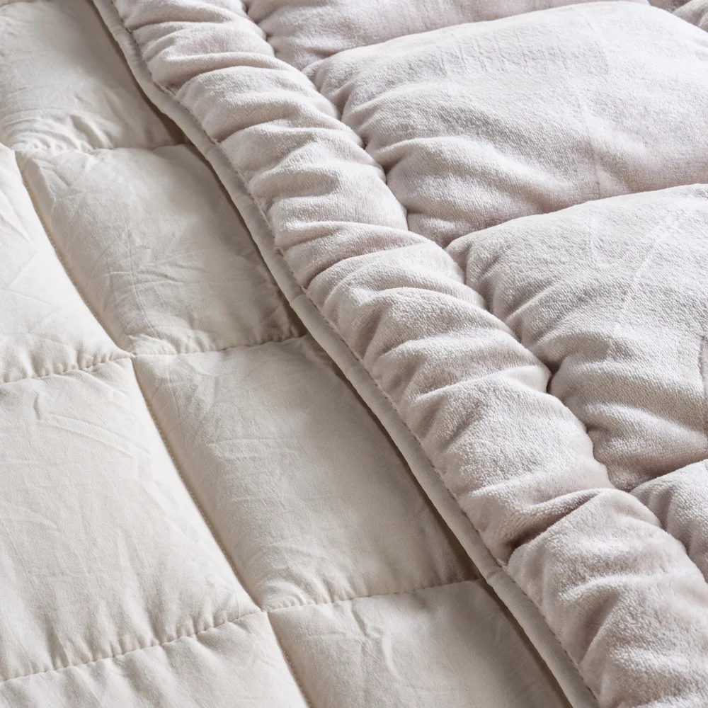 Yorganın bir yüzü plush kumaşlı ve diğer yüzü mikro elyaf kumaşlıdır.
