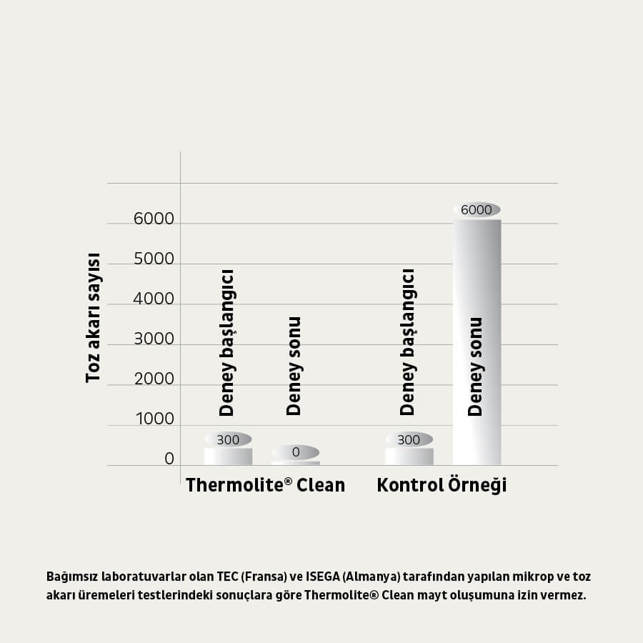 Thermolite ® Clean özelliği, mantar vet toz akarı yaşamasına izin vermez ve hijyenik uyku ortamı sunar. Thermoclean Anti-Mite bebek yorganları, toz akarı hassasiyeti olanlar için ayrıca tercih edilmektedir.